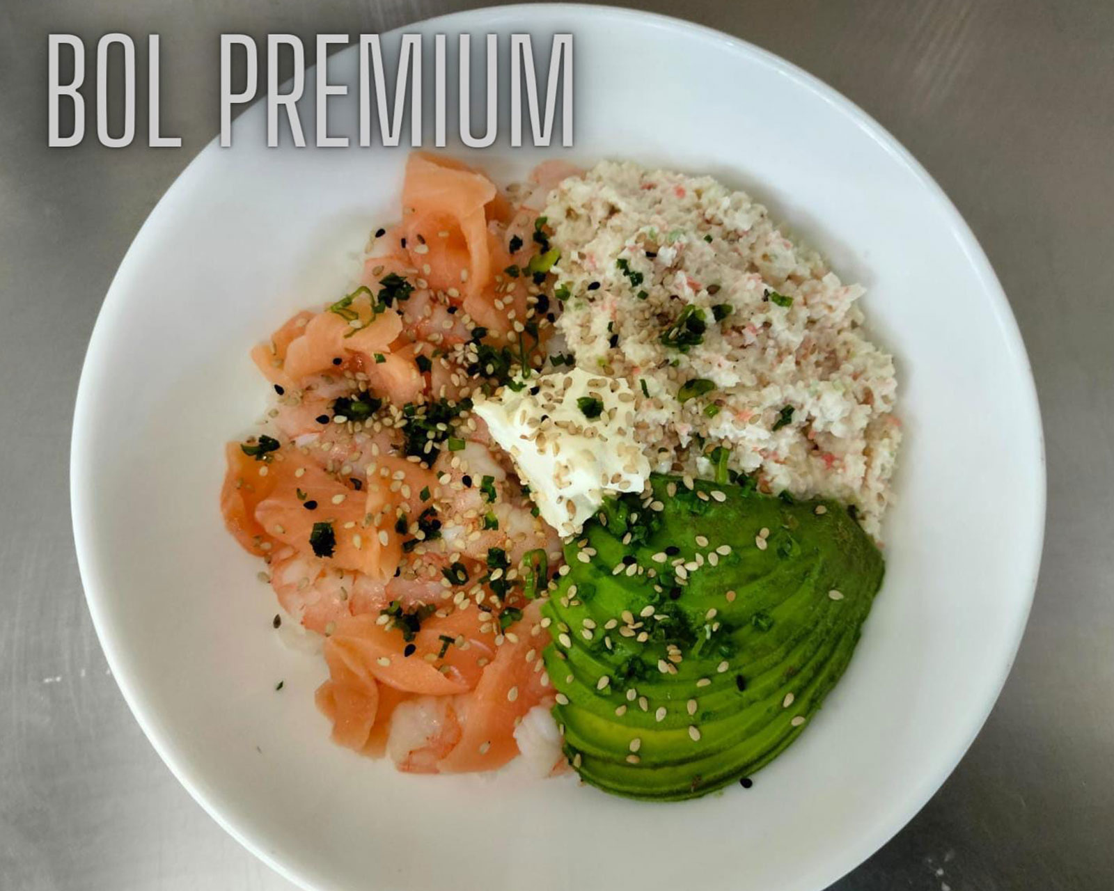 Salmón, camarón, pasta de tampico, aguacate y filadelfia sobre arroz al vapor y ajonjolí y mayonesa spicy.